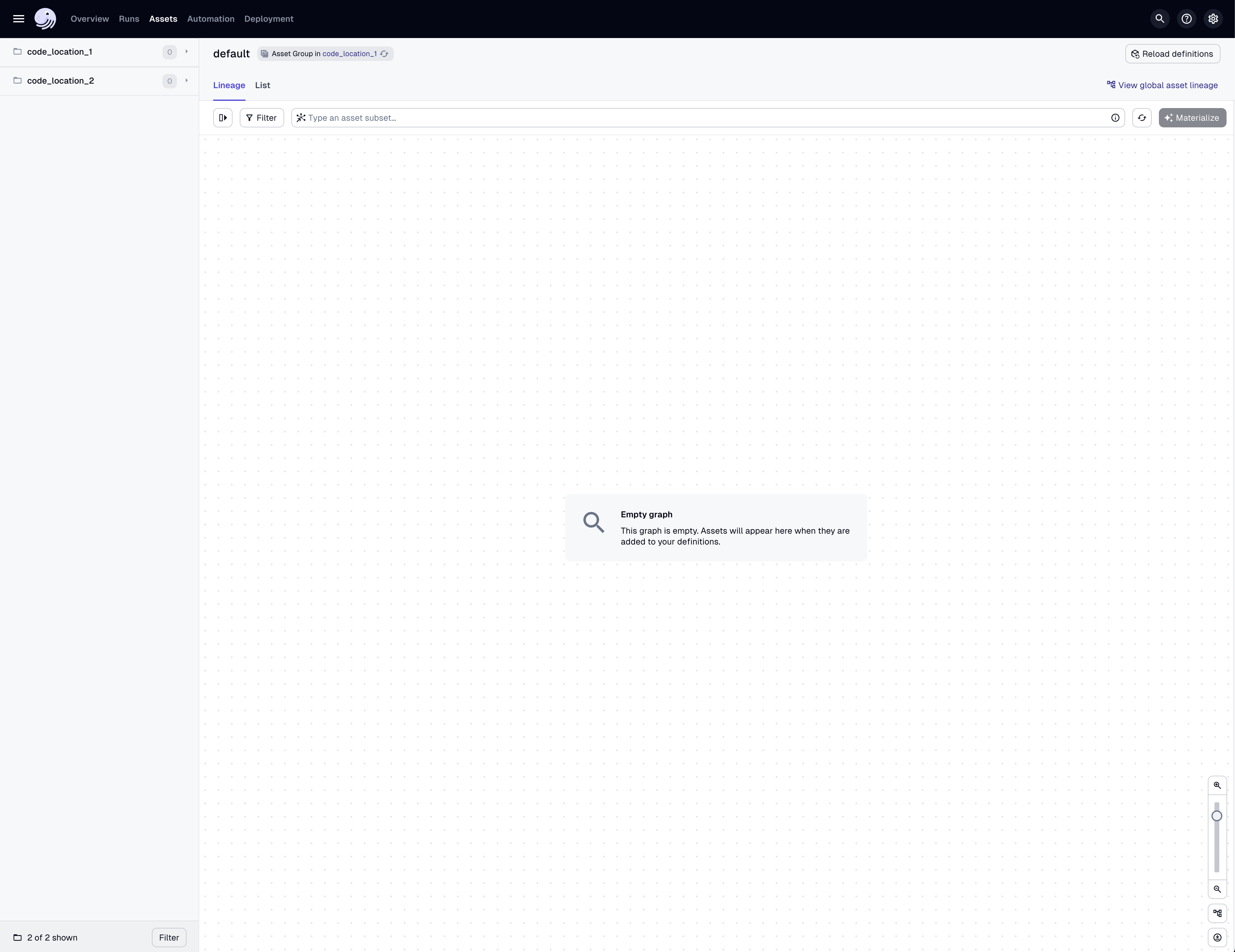 Finally, let's load our two projects with dg dev. When you run dg dev from the workspace root, it will automatically recognize the projects in your workspace and launch each project in a separate process in its virtual environment found in the .venv folder in the project.